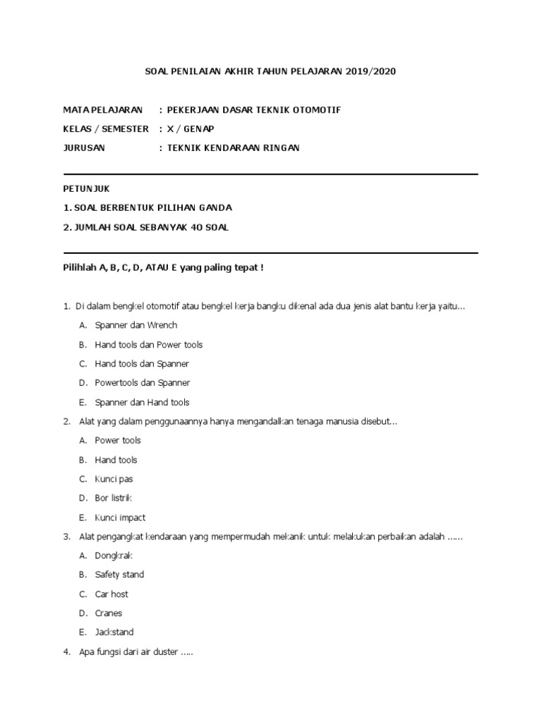 / Soal Pdto Hand Tools / Soal Pdto X Cetak Docx Lembaran Soal Evaluasi Belajar Bersama Mata Pelajaran Pekerjaan Dasar Teknik Otomotif Semester I Ganjil Program Keahlian Teknik Course Hero / Materi pdto hand tools (peralatan tangan)semester 1 kelas10